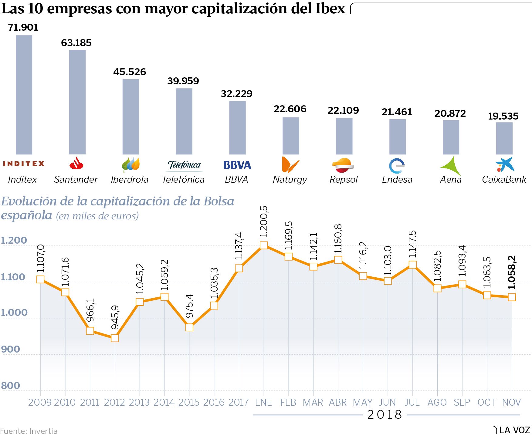 «Brexit» y guerra comercial marcaron el devenir de las bolsas en el 2018 y lo harán en el 2019 Una indigestión que todo apunta a que se traducirá, además de en el mordisco que ha sufrido el Ibex, en la pérdida de un importante listón: el del billón de euros. Hablamos de la capitalización de la Bolsa española. De lo que vale en su conjunto. Todavía no está sobre la mesa la cifra de cierre de ejercicio. Pero en noviembre ya se quedó a un paso de perderlo. Acabó el mes en 1,05 billones. Y diciembre no fue mejor: el Ibex se dejó un 7,2 % y el índice general de la Bolsa de Madrid, un 6,5 %. Por lo que todo hace pensar que nos movemos ya por debajo de esa barrera. Y es algo que no ocurría desde el 2015.
