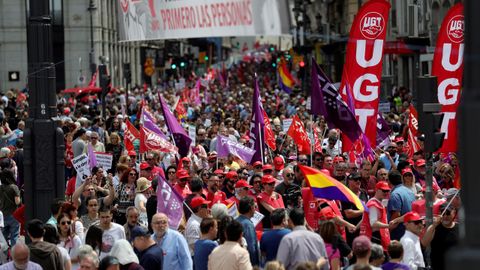 En la manifestación del 1 de mayo en Madrid, bajo el lema de «Primero las personas», los líderes de CC.OO. y UGT piden el reparto de riqueza y la lucha contra la desigualdad