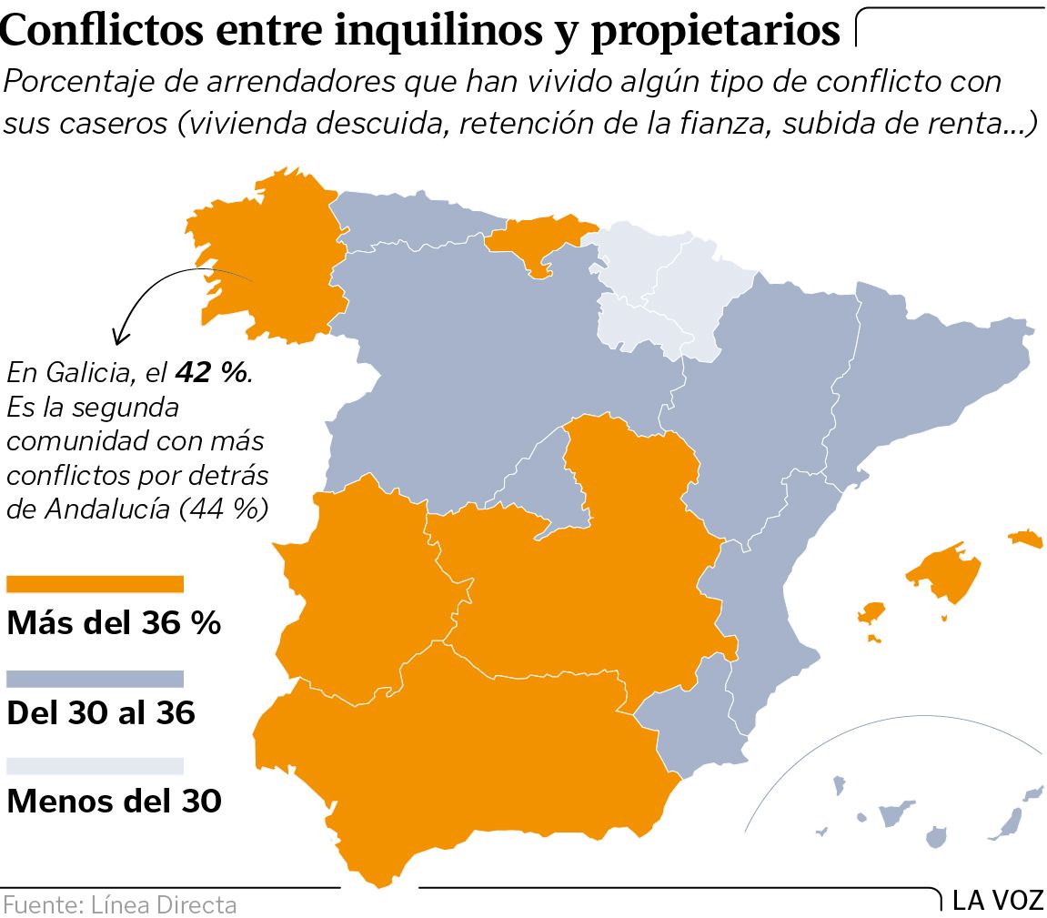 Galicia es, por detrás de Andalucía, la segunda comunidad con más conflictos En el otro lado de la balanza están La Rioja (14 %), Navarra (24 %) y el País Vasco (28 %), las comunidades donde mejor se llevan caseros e inquilinos. También arroja luz la encuesta sobre los motivos por los que los ciudadanos eligen vivir de alquiler. En el caso de los gallegos, más de la mitad (el 53 %, concretamente) lo hacen porque no les queda otra salida. No tienen dinero para comprarse una casa.