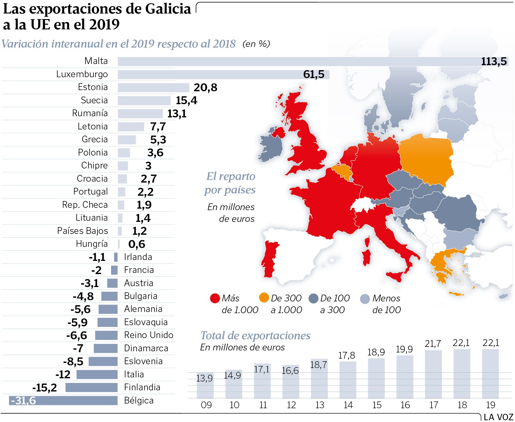 21 feb 2020 . Actualizado a las 11:31 h.Las empresas gallegas vendieron el pasado año en el extranjero productos por valor de 22.196,7 millones de euros, según los primeros datos provisionales hechos públicos por el Ministerio de Industria, Turismo y Comercio. Una cifra que, a la espera de ser revisada, apunta a que la comunidad ha mantenido el tirón exportador en un contexto adverso, de enfriamiento económico, y en el que dos de sus principales motores, como son el textil y la automoción, han perdido protagonismo.