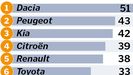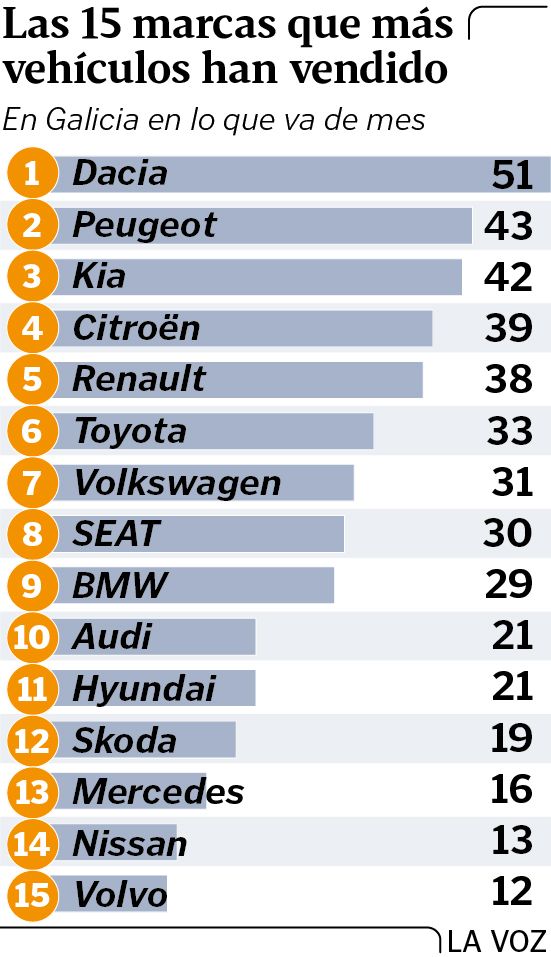 Por marcas, los consumidores gallegos siguen apostando por las más asentadas en el mercado, y por las más asequibles, lo que explica que Dacia, la enseña económica del grupo Renault, lidere el mercado de la desescalada, con 51 unidades matriculadas. Le siguen Peugeot, con 43 modelos vendidos; Kia, con 42; Citroën, con 39 y Renault, con 38.