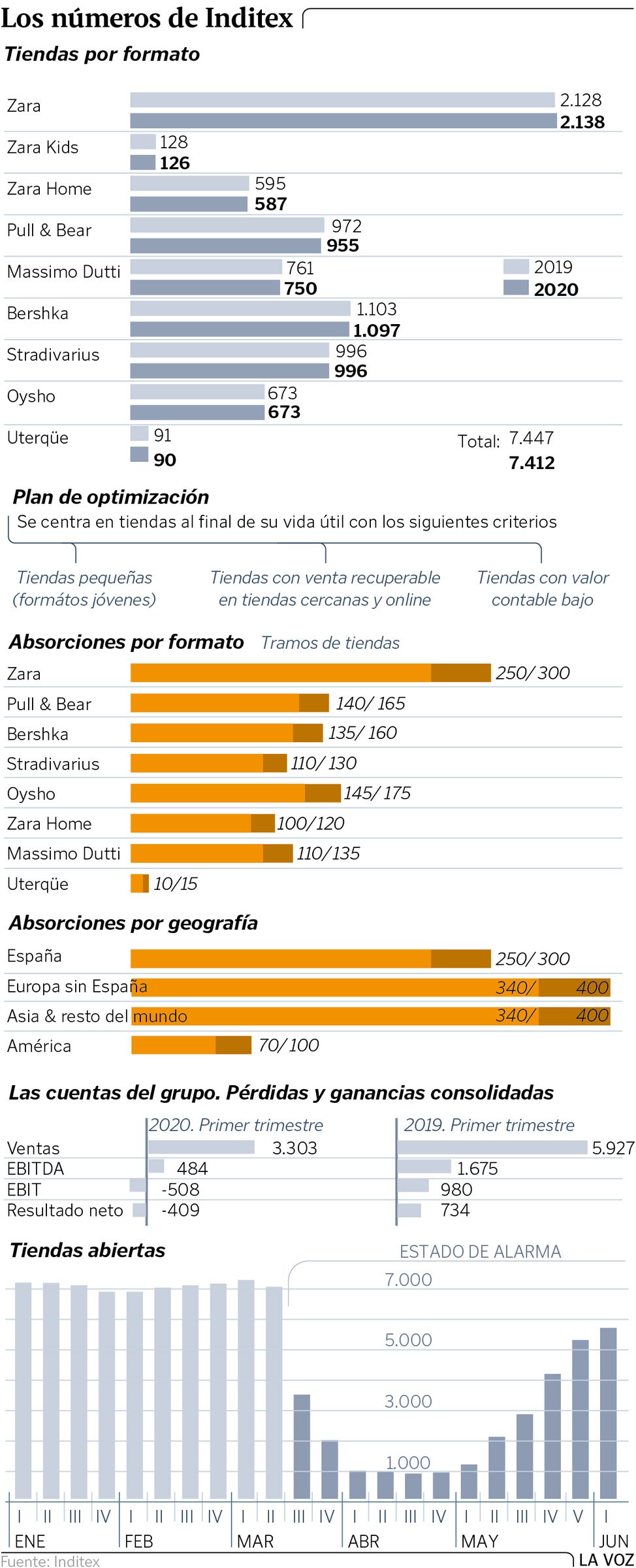 Inditex, que a 30 de abril contaba con una red de 7.412 establecimientos, explicó que los cierres se centrarán en tiendas que están en el final de su vida útil, sobre todo de los formatos jóvenes y cuya venta se puede recuperar en tiendas cercanas y on-line. Isla insistió en que este plan de optimización es una continuación de lo que se venía haciendo desde el 2012, y que se ha aplicado con más intensidad entre el 2017 y el 2019. Todas las tiendas que se cerrarán, matizó, son rentables, pero la medida se toma porque «la visión es a largo plazo.