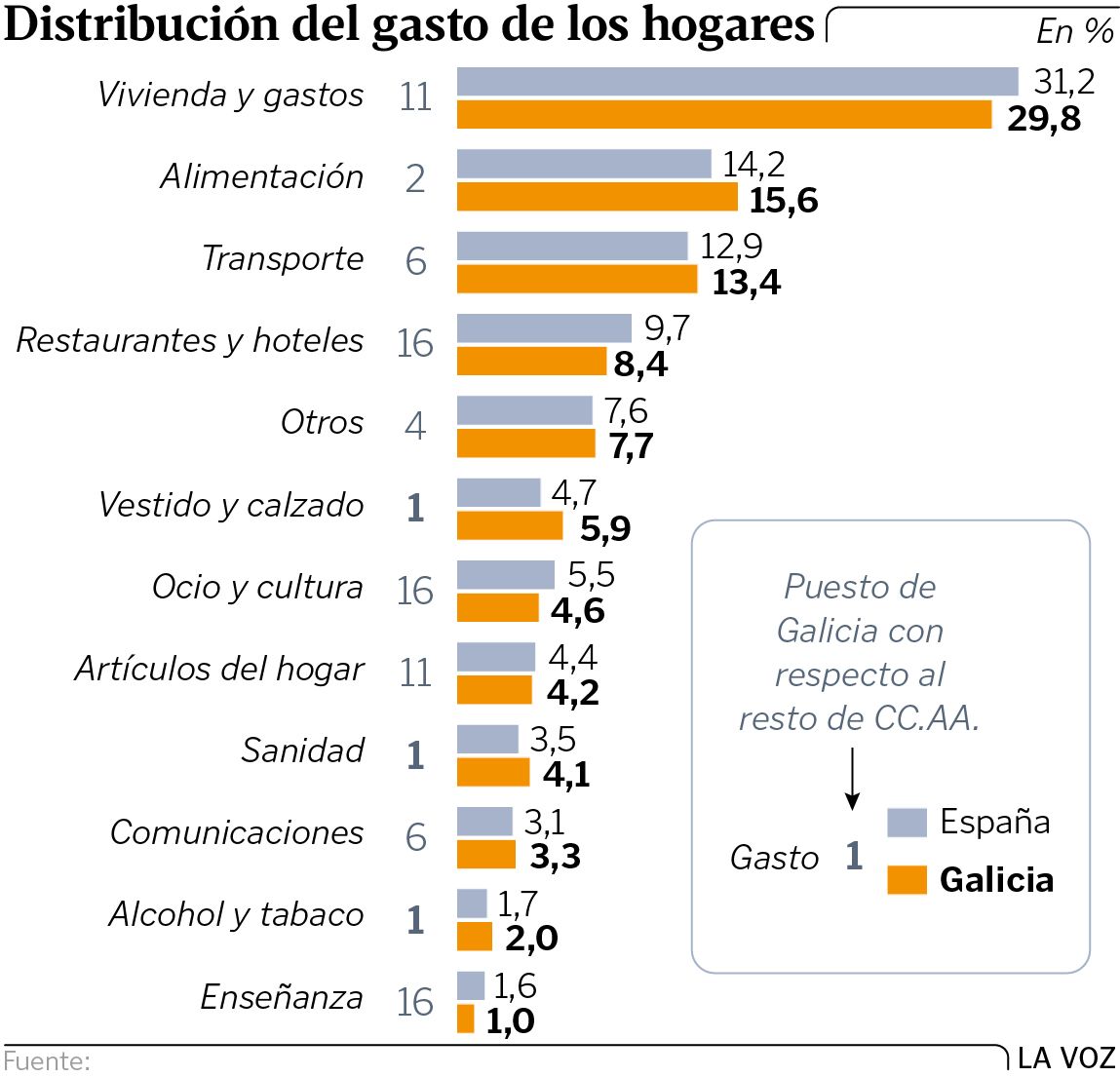 Casi el 60 % de ese presupuesto anual se iba en solo tres partidas: vivienda (que incluye no solo el pago de la casa, sino también el recibo de la comunidad o suministros básicos como la luz, el agua o el gas), alimentación y transporte.