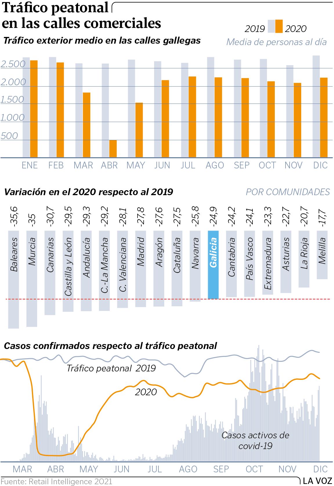 16 may 2021 . Actualizado a las 05:00 h.Con el mundo en casa y las tiendas cerradas, la afluencia en los ejes comerciales de toda España se desplomó el año pasado. En el 2020, el tráfico de potenciales clientes cayó un 27,9 % en el conjunto del país, respecto al 2019, y un poco menos, un 25 % en Galicia.