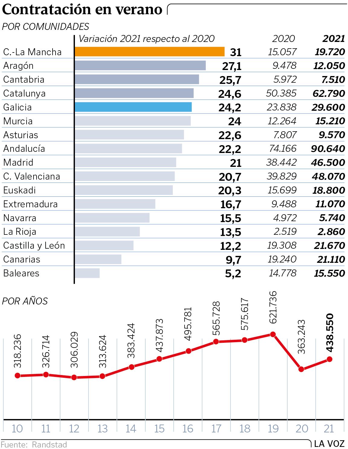 07 jun 2021 . Actualizado a las 19:59 h.De la mano de la vacunación y del levantamiento paulatino de las restricciones a la actividad, que hacen prever una recuperación intensa del turismo, la campaña de verano arranca con optimismo en Galicia. Según la consultora de recursos humanos Randstad, la comunidad generará casi 30.000 contratos —concretamente 29.600—, un 24,2 % más que hace un año, cuando se firmaron 23.838. El repunte estará 3,5 puntos por encima de la media del conjunto del país, donde se espera que las contrataciones escalen un 20,7 %, hasta las 438.550.