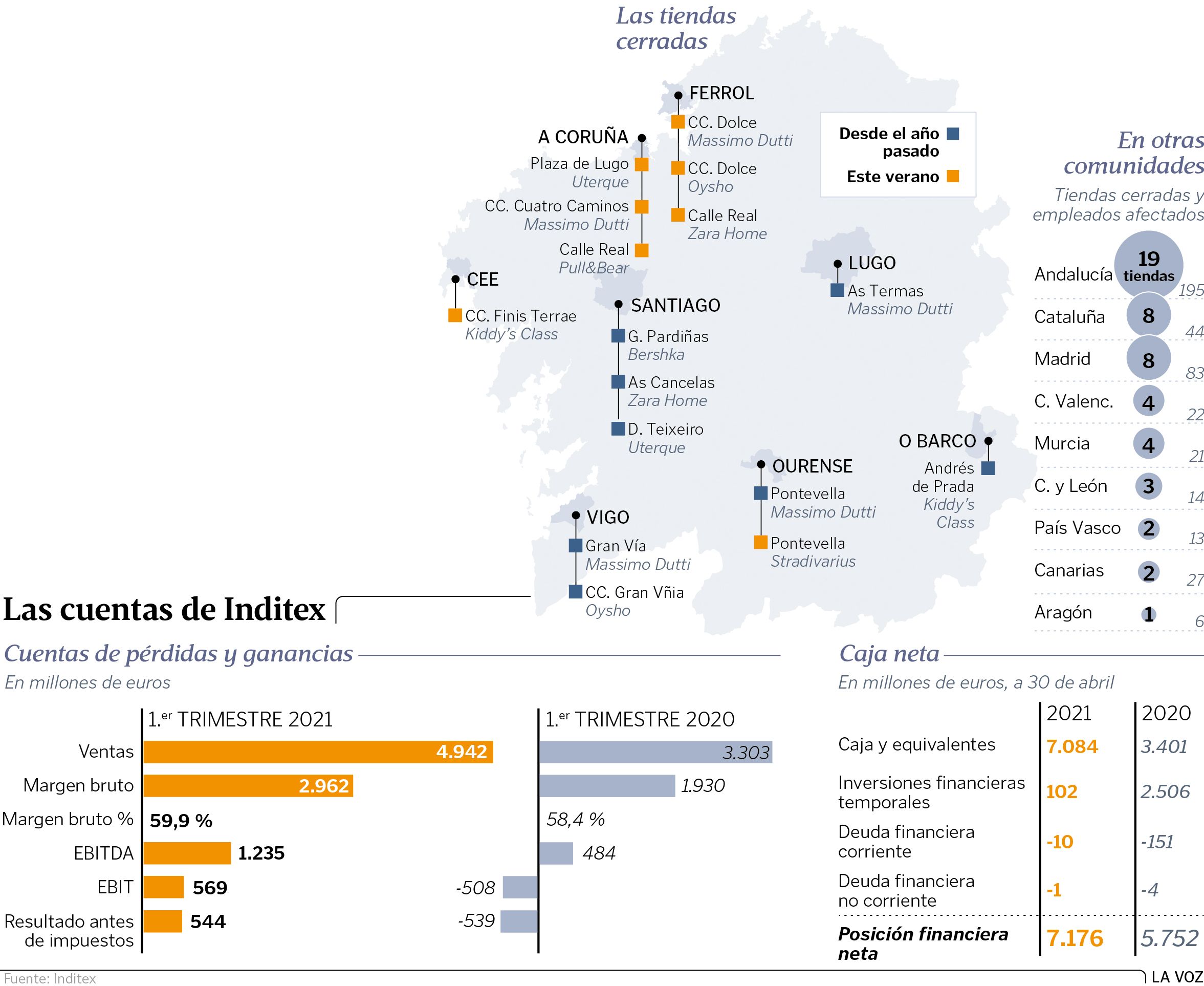 La transformación que está llevando a cabo Inditex respecto a su apuesta comercial es profunda. Pone en marcha tiendas de mayor superficie y con mayor capacidad de integración tecnológica que absorben a otras más pequeñas. Esta política la está llevan a cabo en todos los países en los que está presente. Desde el año pasado se cerraron ocho establecimientos en Galicia y este verano lo harán ocho más, casi todos ellos en la provincia de A Coruña. A cambio hubo ampliaciones y reformas en 13 establecimientos en Santiago, Vigo, Ferrol, A Coruña, Narón y Santiago. A nivel internacional, en el primer trimestre se contabilizaron aperturas en 21 mercados. En la actualidad tiene 6.758 tiendas.
