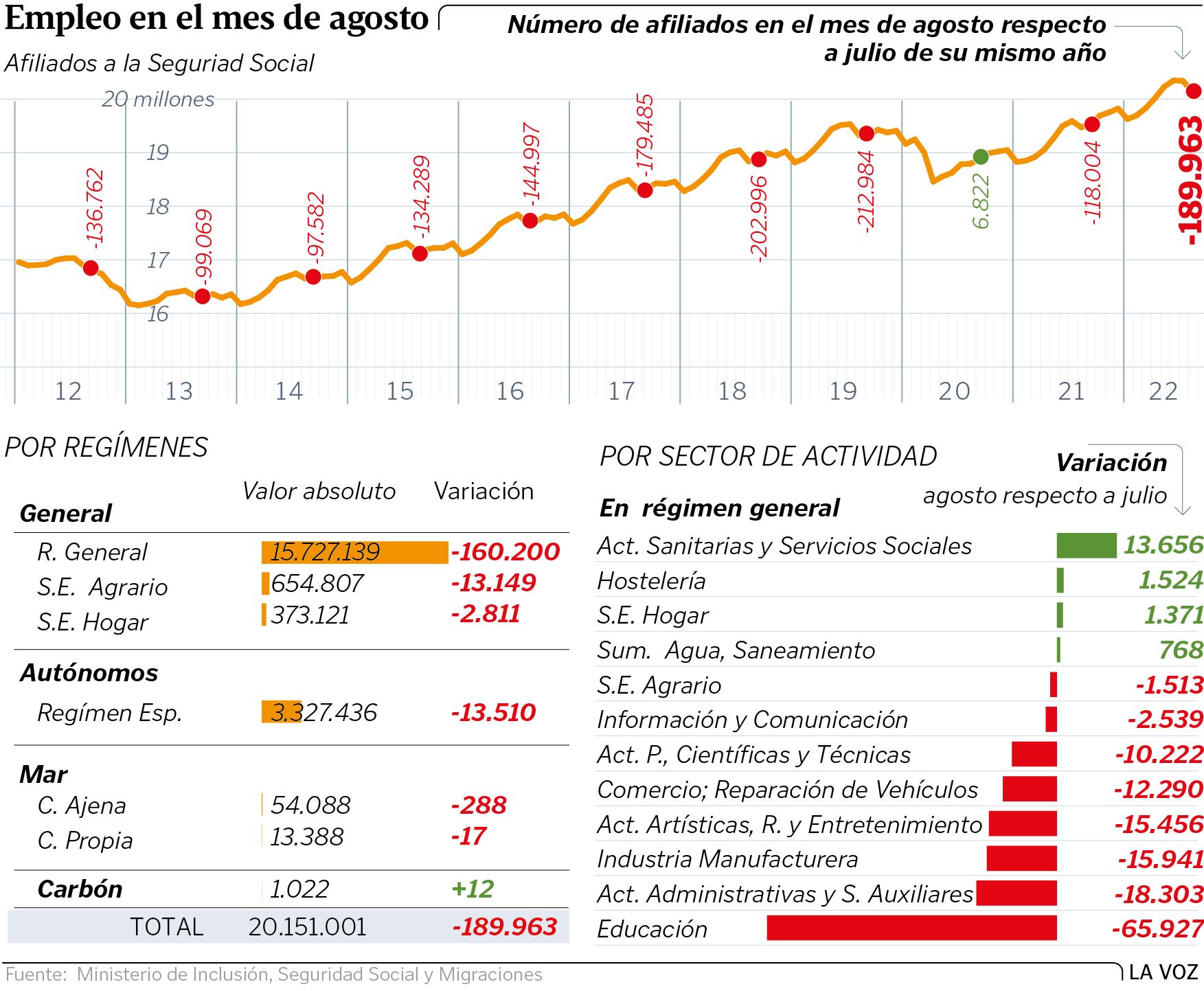 02 sep 2022 . Actualizado a las 20:46 h.Agosto no es un buen mes para el empleo. La temporada turística toca a su fin el día 31 y, con ello, se terminan los contratos ligados a ella, además de que también tiene su impacto el mal comportamiento de la afiliación en sectores como el educativo, la industria y la construcción. El histórico de las estadísticas del Ministerio de Trabajo respalda esta repetidísima idea: desde que comenzó el siglo XXI, el paro registrado se ha incrementado siempre en agosto salvo en tres ejercicios marcados por circunstancias especiales: 2000, 2013 y 2021. El año pasado, el mercado laboral español asistió a su mejor agosto de la serie histórica: el paro bajó en más de 82.000 personas. Lo puede explicar el rebote económico generalizado vivido tras el fatídico año 2020, sacudido por la pandemia de Covid-19 que prácticamente paralizó la economía global.