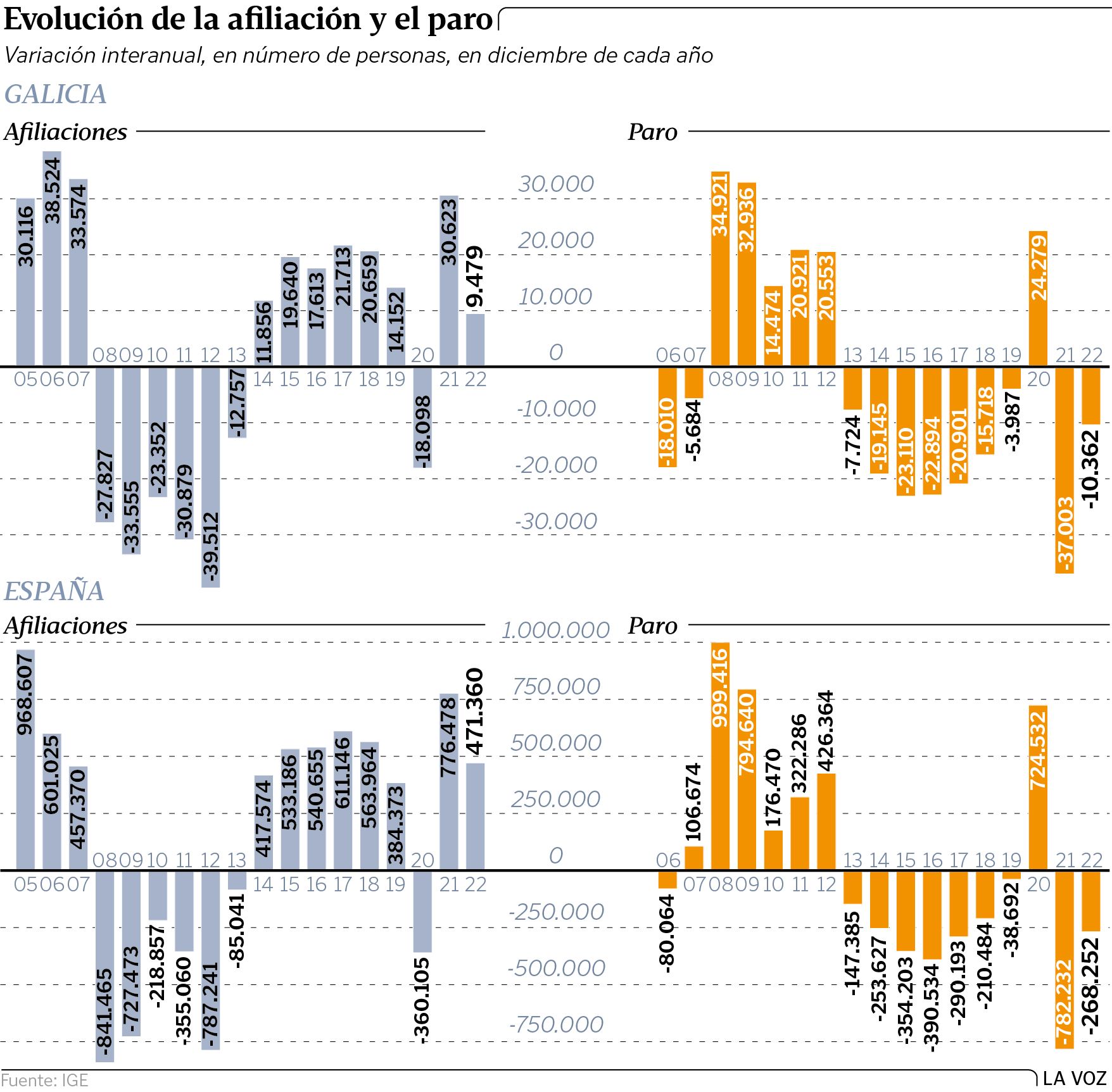 Esa tendencia se replicó en Galicia donde, a diferencia del resto de España, diciembre siempre es un mes de destrucción de empleo, que se vio agravada. Así, los 5.345 afiliados menos del mes pasado son el peor dato en un decenio (excluido el año de la pandemia).