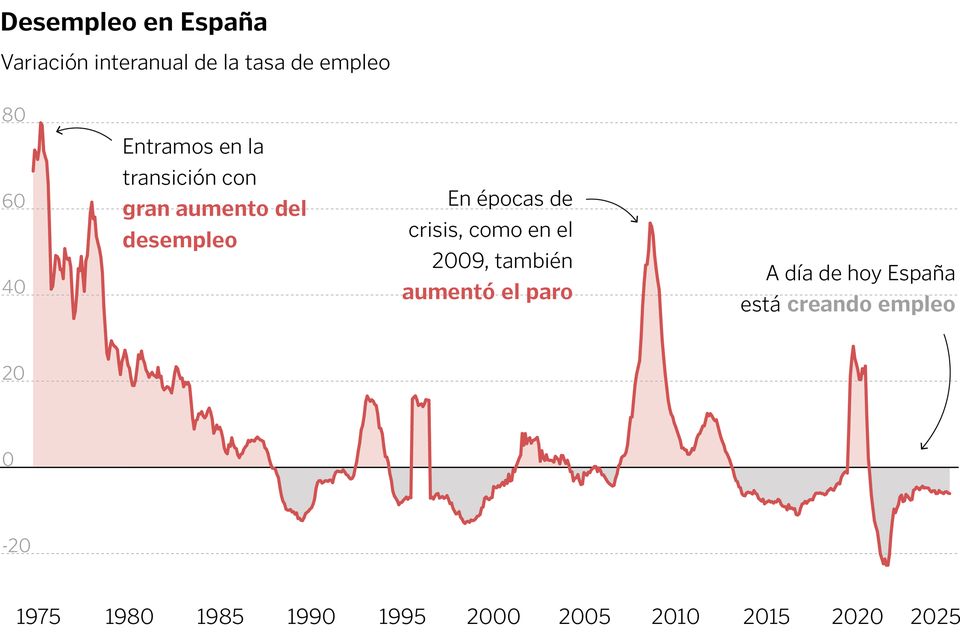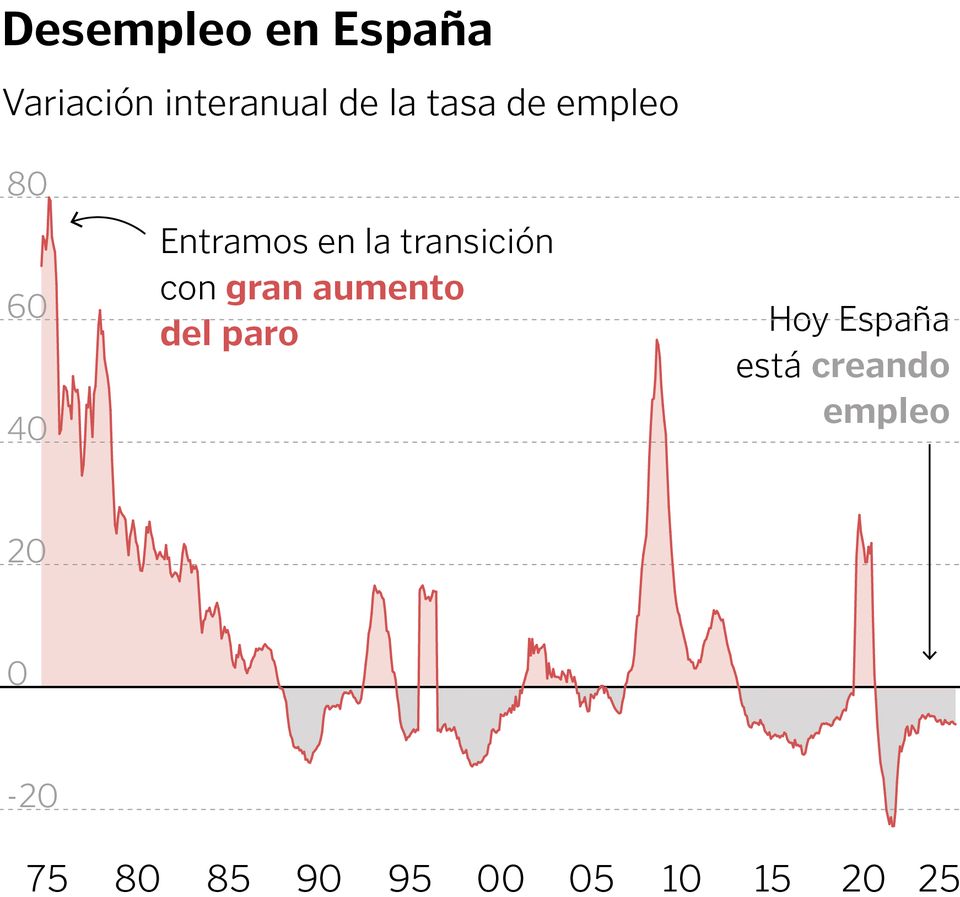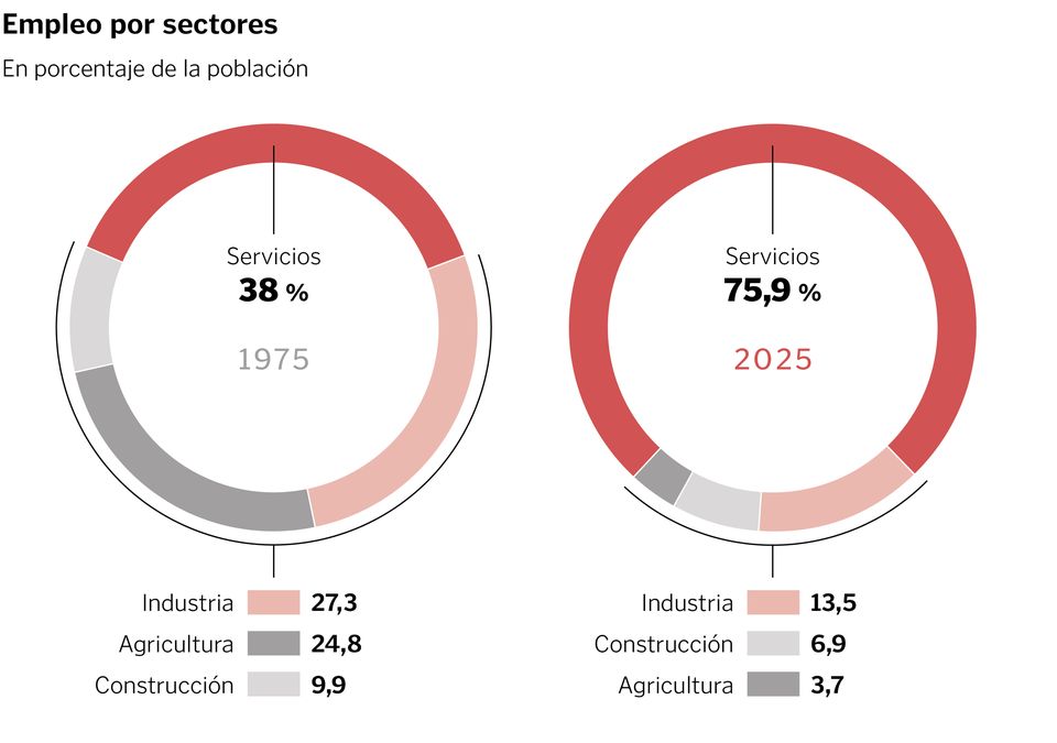 La foto laboral de 1975 lo deja claro: España seguía siendo, en buena medida, un país agrícola e industrial. Casi una cuarta parte de los trabajadores estaban empleados en el campo y más de un 27 % en la industria, mientras que el sector servicios apenas concentraba el 38 % del empleo. Medio siglo después, el paisaje es irreconocible. Los servicios absorben hoy tres de cada cuatro puestos de trabajo, la agricultura se ha reducido a un 3,7 % y la industria apenas supera el 13 %. El país que salió del franquismo era una economía a medio hacer: convivían los primeros síntomas de modernización con enormes lastres heredados de décadas de aislamiento, atraso y desigualdad. El actual, en cambio, se parece mucho más a cualquiera de las economías avanzadas de Europa; una convergencia que ha traído los avances más evidentes, pero también vulnerabilidades nuevas.