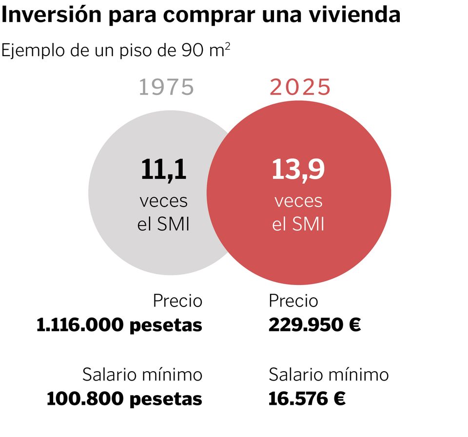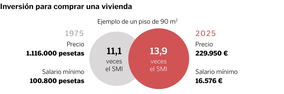 Según el CIS, el acceso a la vivienda es la principal preocupación de los españoles. Especialmente para los jóvenes, que se enfrentan a la titánica tarea de ahorrar la suficiente cantidad de dinero para dar la entrada de una hipoteca en medio de salarios ajustados y alquileres disparados. La dificultad no es nueva: en 1975, hacía falta ahorrar 11,1 veces el salario mínimo para convertirse en propietario; hoy, esa cifra ha subido a 13,9.