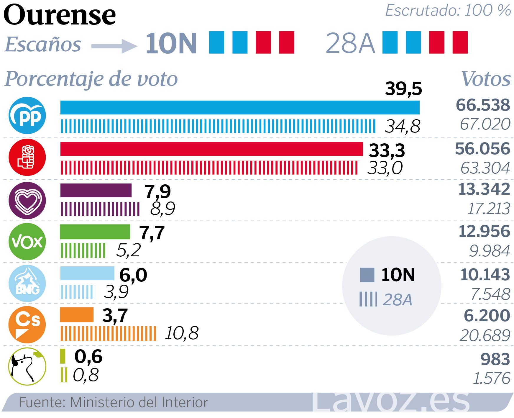 En las elecciones del pasado mes de abril el PSOE estuvo a punto de acabar con la histórica hegemonía electoral del PP en la provincia de Ourense. Este domingo los populares lograron recuperar parte de los apoyos perdidos el 28A, pero no lo suficiente como para romper el empate a dos diputados con los socialistas. El reto que se había marcado el partido presidido por José Manuel Baltar era volver al 3-1 previo, pero no ha podido ser.