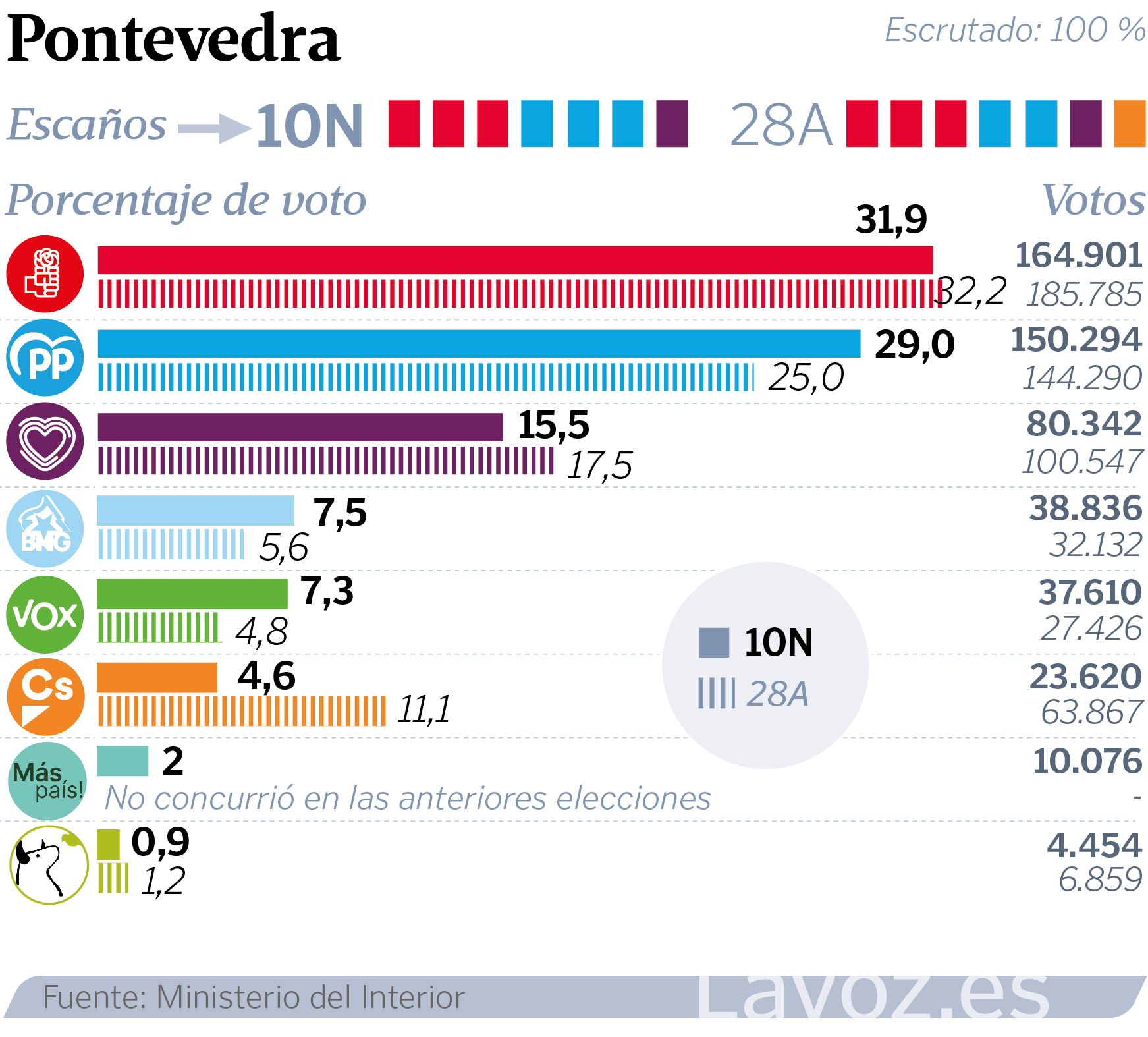 Logró un 7,92 %, un porcentaje muy similar al de Vox. La candidatura encabezada por Begoña Conde -que es la tía materna de Santiago Abascal y que no tiene vinculación directa con la provincia- pasó de 12.956 votos a 12.898. El quinto puesto es para el BNG, que mejoró resultados y logró un 6,02 % de los apoyos. Finalmente, Ciudadanos, que había sido tercera fuerza en abril, ahora es la sexta con un 3,68 %. El partido naranja perdió más de 14.000 votos en siete meses.