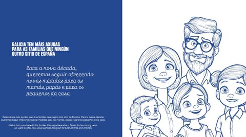 En un formato ilustrado y en tres idiomas (gallego, castellano e inglés), los populares destacan que Galicia tiene más ayudas para las familias que ningún otro sitio de España y apuestan, para la nueva década, por seguir ofreciendo nuevas medidas «para as mamás, papás e os pequenos de cada casa».