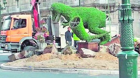 20 may 2015 . Actualizado a las 05:00 h.Corina Porro generó un intenso debate en Vigo cuando instaló setos con forma de delfín en una rotonda. Ayer, al menos durante una hora, aquella idea tuvo su réplica en forma de dinosaurio. El Concello está dando las últimas pinceladas a las obras en la céntrica Rosalía de Castro para que el domingo estén terminadas. Por la mañana, los operarios instalaron un seto con forma de dinosaurio en una rotonda de nueva creación.