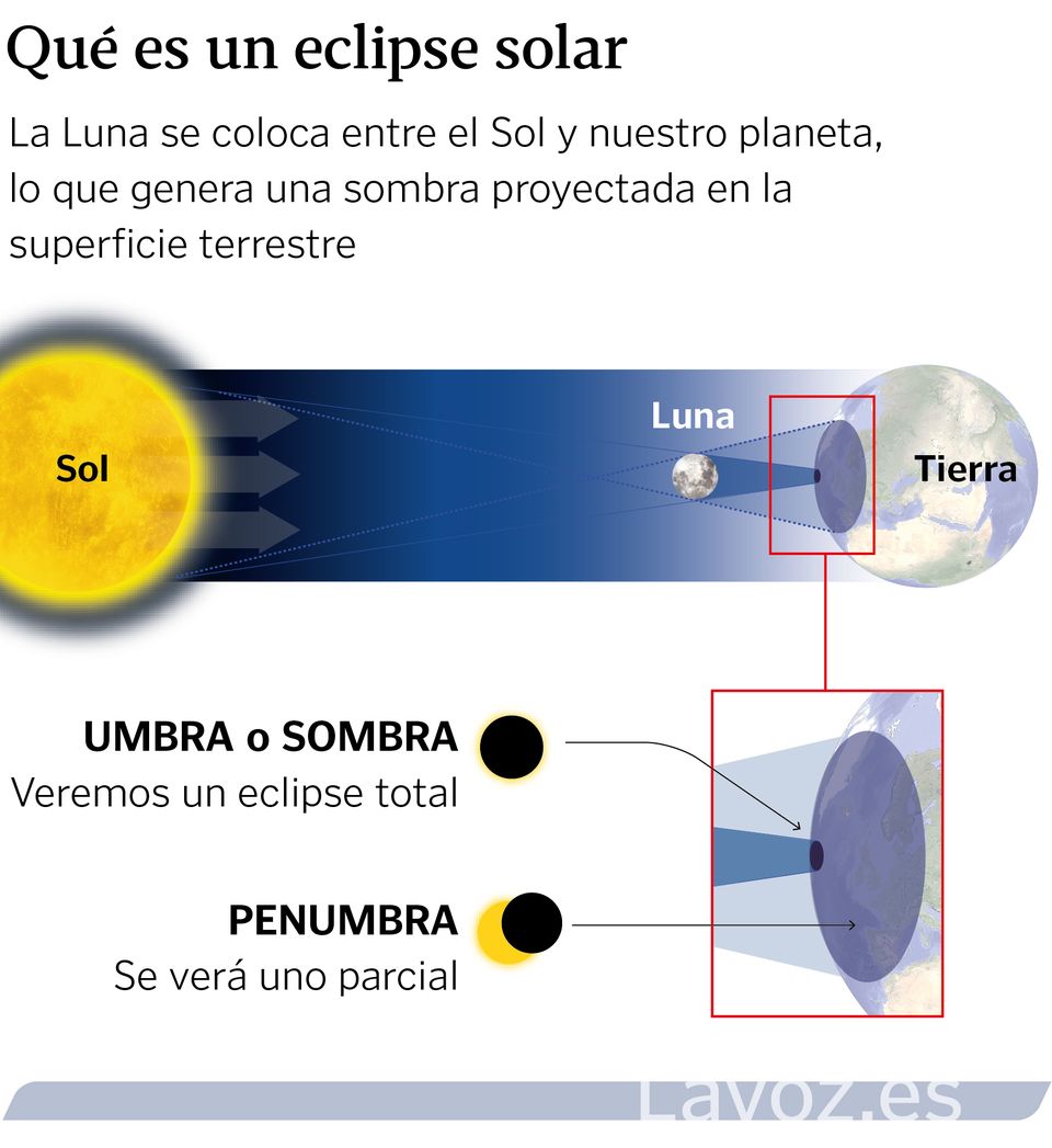 21 nov 2025 . Actualizado a las 16:10 h.Los próximos tres años traerán a España un eclipse de Sol cada uno. Estos eclipses serán dos totales, en el 2026 y el 2027, y uno anular, en el 2028. El más interesante para nosotros es el primero, porque el 12 de agosto del año que viene la sombra de la Luna recorrerá el norte de la península ibérica, desde la costa de A Coruña hasta las islas Baleares.