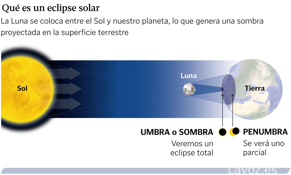 La región exterior se denomina penumbra, y se extiende por los lugares en donde el eclipse se percibe como parcial, es decir, donde la Luna está ocultando solo una parte del disco solar. El pequeño óvalo negro se denomina umbra (‘sombra', en latín) y cubre los lugares en los que el Sol está completamente cubierto por la Luna.