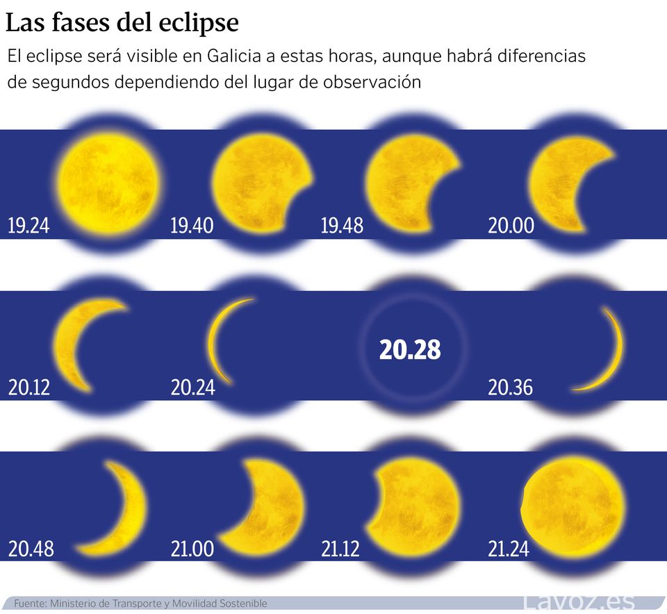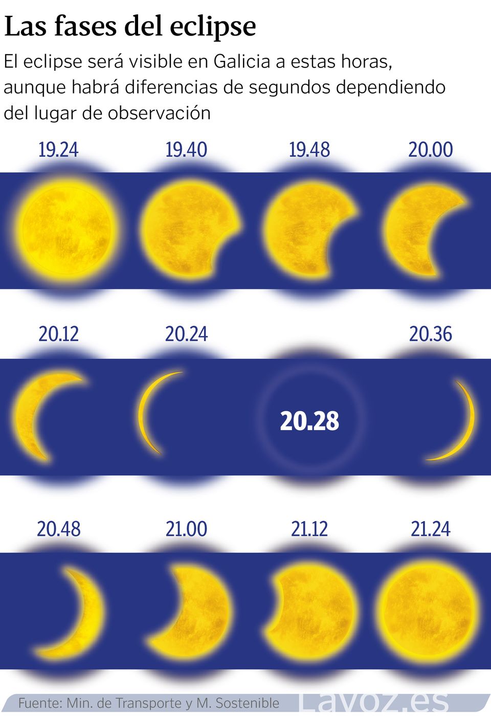 A Coruña disfrutará del eclipse más alto, con el Sol a 12 grados sobre el horizonte, mientras que en Zaragoza estará ya a 6 grados y en Palma de Mallorca a menos de 3. Esto implica que árboles, edificios o el propio relieve del terreno podrán ocultar el Sol, por lo que deberemos buscar lugares con una vista despejada hacia el noroeste para disfrutar bien del eclipse.