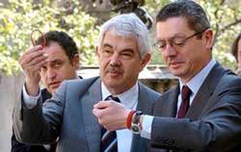 El presidente de la Generalitat, Pasqual Maragall (izquierda), muestra la pulsera de apoyo a la candidatura olímpica Madrid 2012 que le regaló ayer el alcalde de la capital, Alberto Ruiz Gallardón, durante la firma de un convenio por el que el consistorio madrileño se incorpora al patronato de Casa Asia, institución con sede en Barcelona. En el acto también estuvo presente el regidor de la Ciudad Condal, Joan Clos, que asimismo recibió otra pulsera olímpica.
