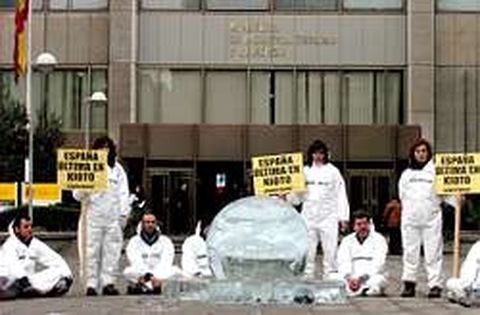 Una quincena de activistas de Greenpeace, vestidos de blanco y con carteles en los que se podía leer «España, última en Kioto», entraron ayer por sorpresa con una furgoneta en el Ministerio de Industria para exigir una reducción de las emisiones de CO2 a la atmósfera. Los activistas, tras retirar la furgoneta, transportaron una gran bola de hielo, con la que simbolizaban la fragilidad del planeta Tierra ante el cambio climático, y denunciaron la «falta de compromiso» del Gobierno.