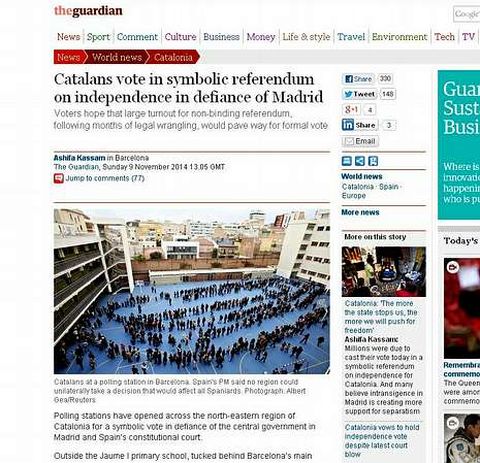De «ejercicio teatral» calificaba el referendo fallido The New York Times, que sin embargo advertía de que «la campaña [a favor de la independencia] irá a más hasta que se le dé a la gente el derecho a decidir si permanecer o no en España». El rotativo liga el desafío soberanista con el descrédito de la clase política española, carcomida por la corrupción e incapaz de lidiar con este problema, escenario que no creen que mejore tras las próximas generales, en las que la irrupción de Podemos podría impedir que se conforme una mayoría estable. En ese contexto, el diario entiende que «una gran coalición [PP-PSOE] podría ser la mejor vía para resolver la situación catalana», al tiempo que advertía de que cualquier intento de declarar de forma unilateral la independencia por parte del Gobierno regional podría acabar en la bancarrota de la comunidad si el Ejecutivo central deja de financiarlo.