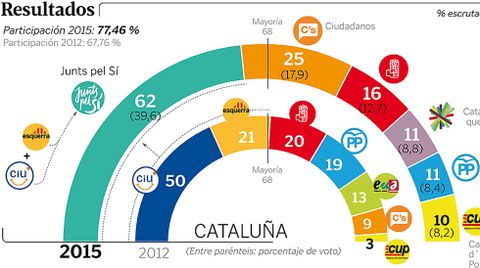 Junts pel Sí, la lista que engloba a CDC y ERC, se impuso con claridad, pero con sus peores resultados desde 1980. Artur Mas necesitaría sin embargo el apoyo de los 10 diputados que obtienen los radicales de la CUP para ser investido de nuevo como presidente de la Generalitat. Y estos han anunciado que, aunque apoyarán el plan para la desconexión con España, no le harán presidente. A Mas ni siquiera le bastaría la abstención de la CUP en segunda votación para ser presidente, la salida con la que contaba hasta ayer. Si esta negativa se mantiene, el líder de CDC tendría imposible lograr la investidura y probablemente se verá obligado a ceder el testigo a otro candidato de Junts pel Sí, que podría ser el cabeza de lista, Raül Romeva, o el líder de ERC, Oriol Junqueras.