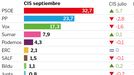 11 sep 2025 . Actualizado a las 18:42 h.El PSOE de Pedro Sánchez arranca el nuevo curso político con una ventaja de nueve puntos sobre el PP en intención de voto, según el barómetro de septiembre del Centro de Investigaciones Sociológicas (CIS), dirigido por el socialista José Félix Tezanos. De acuerdo al sondeo, el PSOE alcanzaría el 32,7 % de los sufragios en unas generales, mientras que el PP de Alberto Núñez Feijoo se quedaría en un 23,7 %.