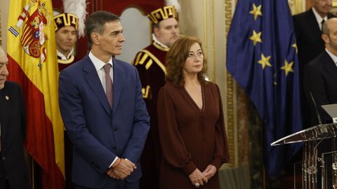 Tras el izado de la bandera, la presidenta del Congreso, Francina Armengol, reivindicó en el Salón de los Pasos Perdidos, el «consenso» y el «interés general» que hizo posible en plena Transición la redacción de la ley de leyes. «Se negoció duro. Se escuchó, se debatió, se dialogó, se cedió. Pero, sobre todo, se llegó a consensos», prosiguió con una lectura que fue aplaudida incluso por los representantes del PP en el recinto.