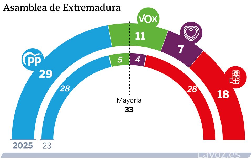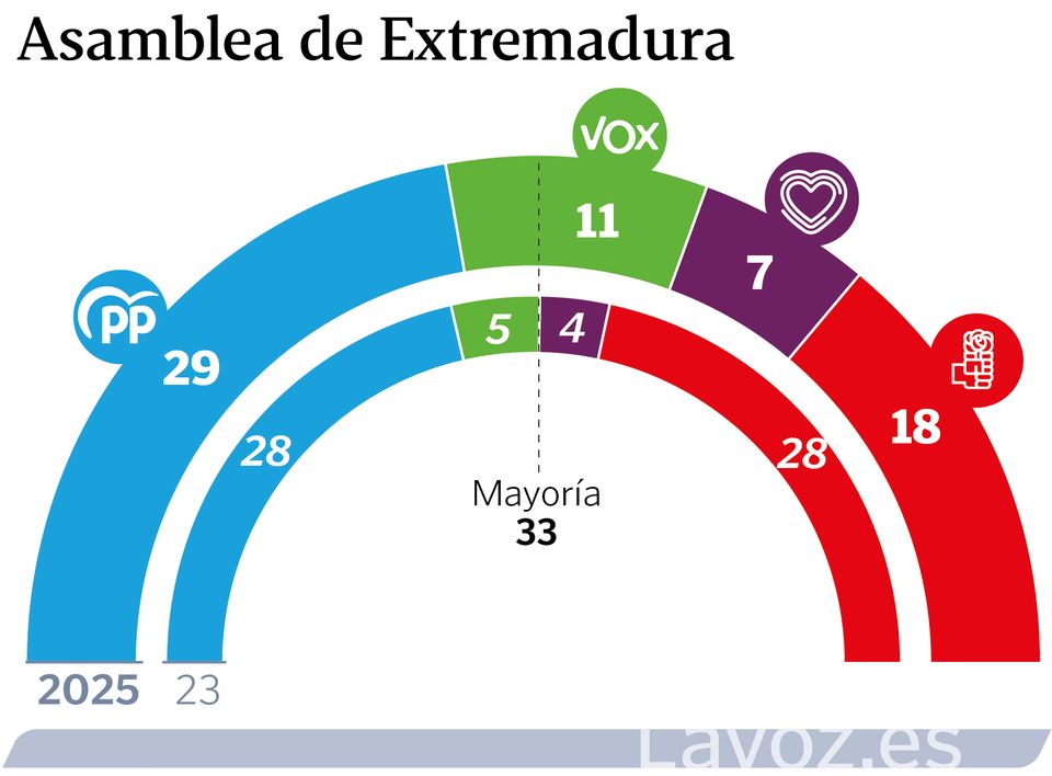 Las direcciones nacionales de ambas formaciones siguen manteniendo conversaciones discretas pero dando más importancia a Extremadura porque los plazos apremian mucho más. Guardiola se presenta a su investidura con la única certeza de que este martes se pondrá en marcha el reloj para la elección del nuevo Gobierno regional o, en caso de que no se consiga, para la convocatoria de otras elecciones anticipadas. La constitución de las Cortes aragonesas, en cambio, no es más que un trámite donde PP y Vox marcarán posiciones ante un diálogo que se intensificará cuando haya que firmar un pacto de Gobierno y el reparto de las consejerías que conformen el futuro Ejecutivo autonómico de Jorge Azcón.