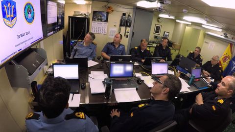 Después de los preparativos y de las reuniones previas a la navegación -en la imagen, a bordo de la fragata española con base en Ferrol- las diferentes unidades dieron comienzo al adiestramiento, que se extenderá hasta el 28 de mayo.