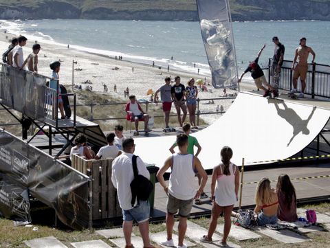 Desde primera hora de la mañana estaban abiertos todos los establecimientos que se han asentado en una plataforma justo al lado del arenal. Pista de skate, puesto de información del Concello de Valdoviño, varias terrazas, ocho food trucks -caravanas de comida- y hasta una tienda de Pull&Bear. También la panadería Arribi, de Cedeira, cuenta con un stand en el que venden raciones de su famoso pastelón, del que tienen hasta 15 tipos distintos. Junto con Pull&Bear, la pista de skate es lo que más visitas ha tenido durante la tarde.