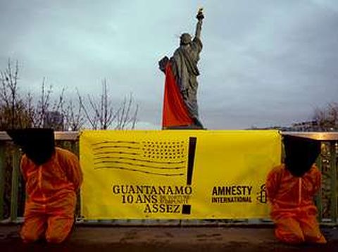Los países europeos encabezaron las críticas al centro de detención de Guantánamo, pero solo acogieron a medio centenar de presos, y los grupos de defensa de derechos humanos estiman que podrían haber hecho más. Militantes de Amnistía Internacional Francia cubrieron ayer con una lona color naranja la réplica de la estatua de la Libertad en París para exigir el cierre la prisión. foto JOEL SAGET AFP