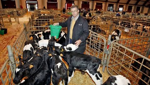 Lo primero que hacen es darle el biberón al ganado, que en ningún caso puede tener menos de quince días para ser vendido. El biberón es un caldero de plástico lleno de suero con agua que, en el culo, tiene una tetina del tamaño de mi pulgar. Las reses maman como si no hubiera un mañana.