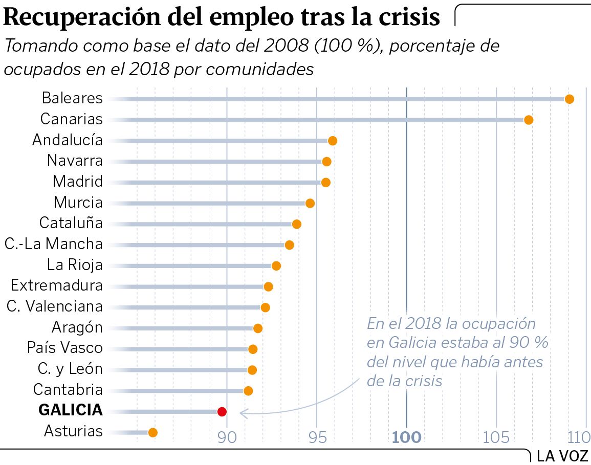 El informe destaca también la reducción del número de desempleados en más de 25.000 personas el año pasado, «con especial descenso, do 71 %, entre os parados de longa duración», recalcó Meixide, aunque matizó que «é un avance inferior á media española». Así, el empleo en Galicia, aun siendo el 2018 el mejor año de los últimos once, ronda hoy el 90 % del que había antes de la crisis. Destacó también la sincronía entre la evolución del PIB autonómico y el nacional, el 2,8 % y el 2,6 % respectivamente, un fenómeno que «non acontecía desde hai case década e media».