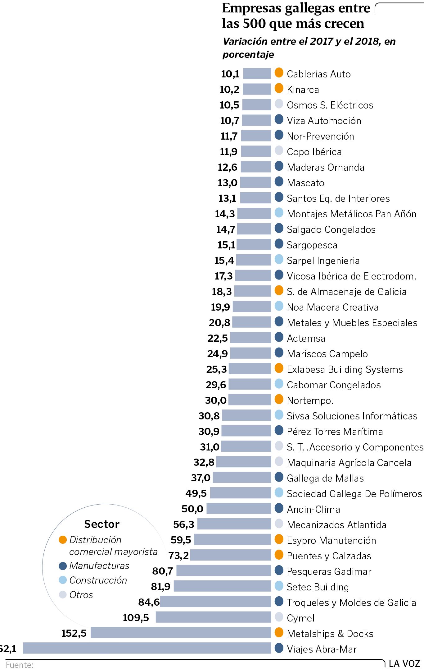 La que puede presumir de un mayor crecimiento (un 139,43 % en concreto) es Viajes Abra-Mar, una compañía situada en Vigo que nació como agencia de viajes especializada en servicios a empresas. También en la ciudad olívica tiene su sede el astillero Metalships & Docks, la segunda compañía que presenta unos mayores datos de crecimiento (101,36 %). La medalla de bronce (con un crecimiento en el último año del 64,83 %) se la lleva Cymel, una empresa familiar constituida en 1977 en Santiago que se dedica a los montajes eléctricos de alta, media y baja tensión.