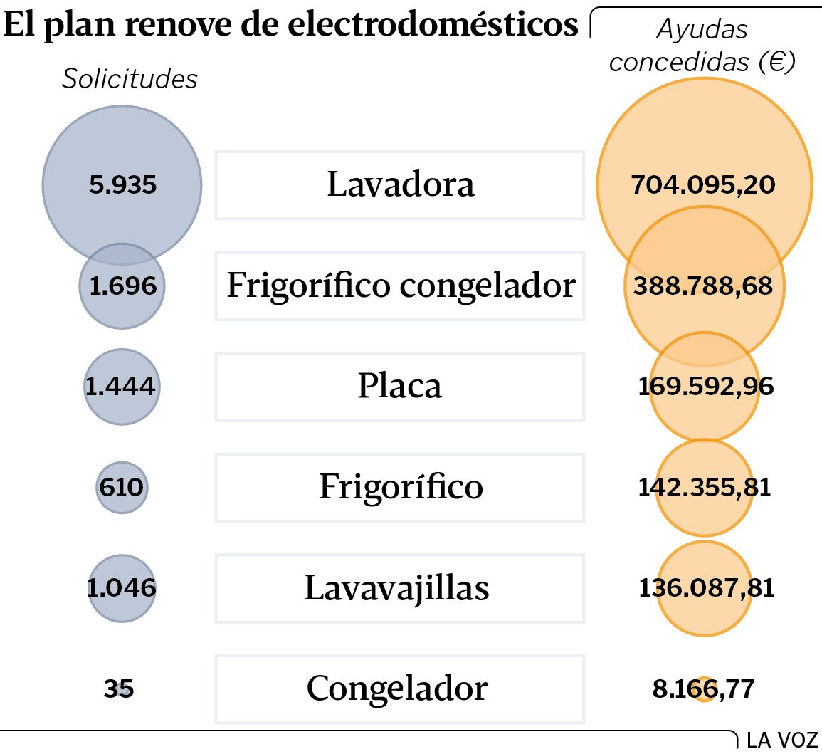 07 ago 2020 . Actualizado a las 05:00 h.Si se está planteando jubilar algún electrodoméstico de casa, ya sea por una avería o para reducir el consumo, sepa que no debería retrasar mucho la decisión. Al menos, si quiere optar a las ayudas que concede la Xunta para renovar estos aparatos, que están a punto de agotarse. Tan solo quedan 170.000 euros de los 1,72 millones de euros con los que se dotó este año un plan renove orientado a fomentar el ahorro energético. El mismo día en el que se abrió el plazo, el pasado 1 de julio, se recibieron más de 1700 peticiones. Ayes, apenas un mes después, ya se habían aprobado casi 10.800 solicitudes, aunque en algunos casos el desembolso de la ayuda está pendiente de la presentación de la documentación requerida, tal y como explican desde la Consellería de Economía, Emprego e Industria.