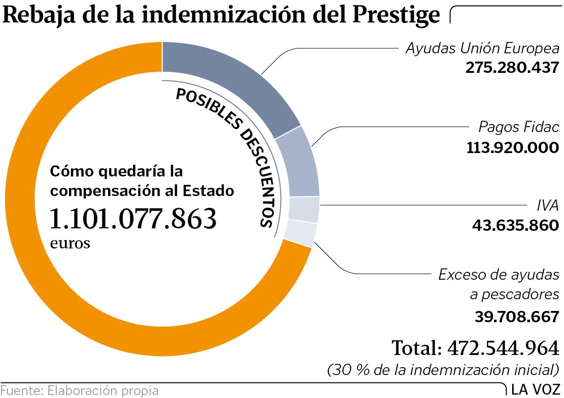 También creen que deben ser descontados los 113,9 millones que el Estado español ya cobró del Fondo Internacional de Indemnización de Daños por Hidrocarburos (Fidac). De la misma forma, consideran que deben deducirse los 275,2 millones recibidos por la Administración central en concepto de ayudas de la Unión Europea para asuntos relacionados con la marea negra, como la operación para extraer el fuel de los pecios del petrolero.