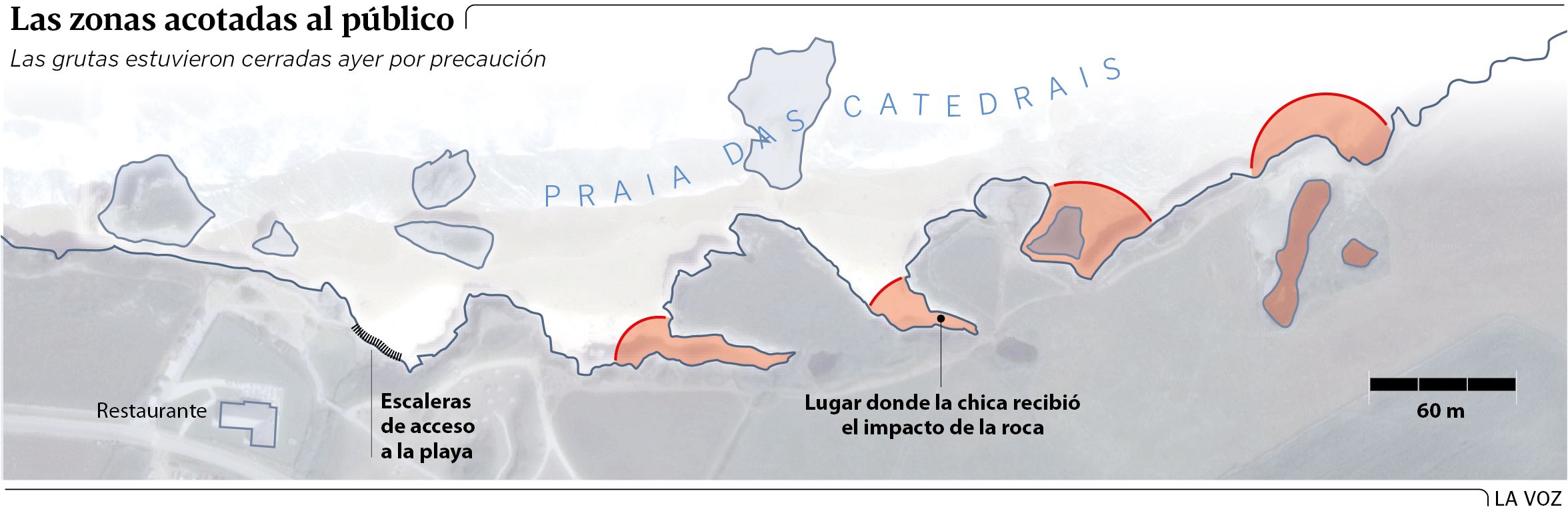 El acceso al arenal de Ribadeo dejará hoy de estar controlado hasta el verano En todo caso, las diversas fuentes consultadas por La Voz aseguran que no existe un plan de emergencias para el arenal. Especialistas en patrimonio marítimo señalaron que Irene Baladrón perdió la vida en una zona de dominio público marítimo terrestre, cuya competencia es de la Dirección General de Costas del Estado. «Mala suerte es que en una playa desierta te caiga un rayo encima, no que después de una sucesión de temporales y alertas naranjas te alcance una roca que se desprende de una urna como las que hay en la playa de As Catedrais», apuntaron las mismas fuentes.