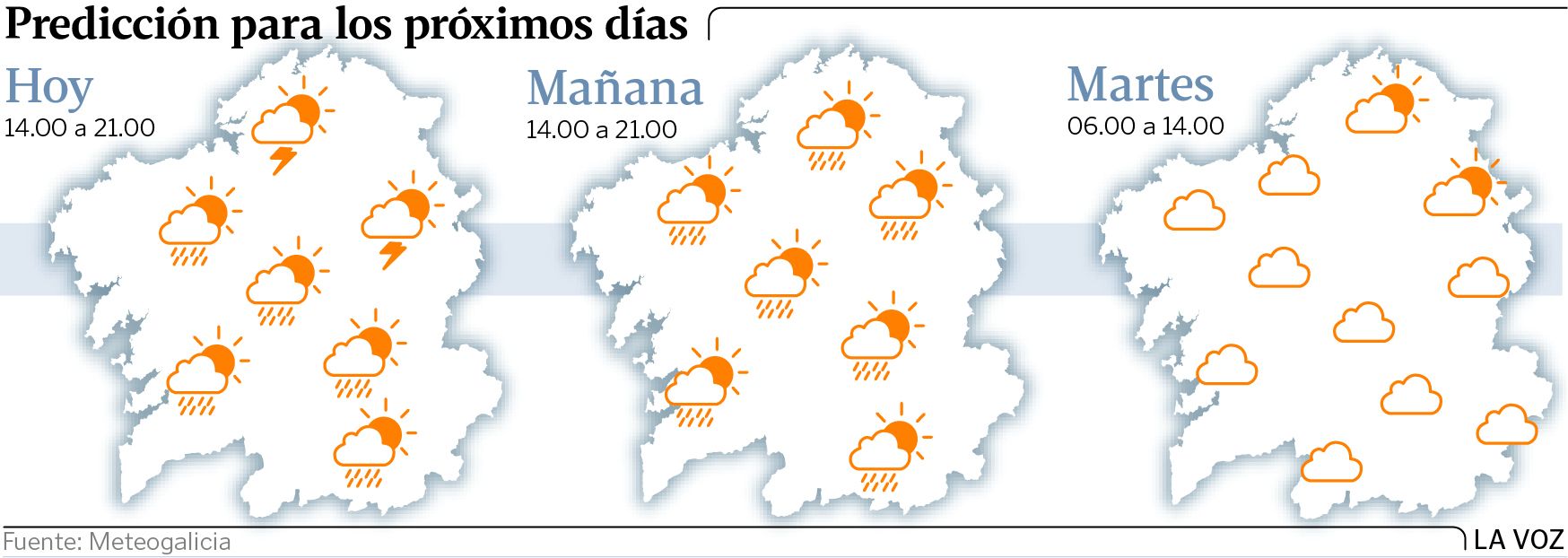 Lluvias y chubascos serán la tónica general de las jornadas del lunes y del martes, aunque ya reduciéndose en cantidad e intensidad. También la sensación térmica comenzará a cambiar a partir de entonces, sobre todo por el ascenso de las mínimas y en algunos puntos, como en Ourense, también las altas.