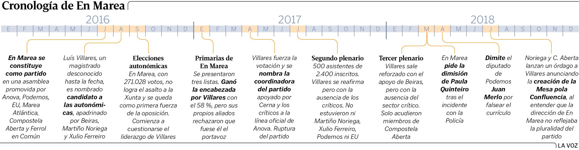09 ago 2018 . Actualizado a las 05:00 h.Dos meses separan las sonrisas de la asamblea fundacional de Vigo de las caras largas de la noche electoral de las autonómicas, cuando los fundadores de En Marea vieron roto el sueño de alcanzar el poder en la Xunta. Todavía no se habían despertado de la pesadilla y ya empezaron los problemas, personificados en la pérdida de confianza del mirlo blanco que ellos mismos buscaron en los tribunales: Luís Villares. Y dos años después, de aquella marea, esta resaca.