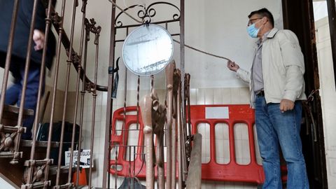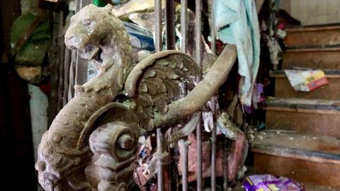 En el zaguán, la linterna del móvil permite enfilar las escaleras de madera con un pasamanos labrado de una gran calidad artística. Es un dragón alado el que recibe al visitante, que tiene que sortear cachivaches y enseres que se acumulan en el hueco de la escalera. A medida que se asciende, el olor nauseabundo se hace más penetrante.