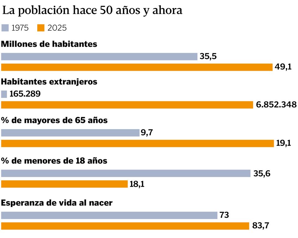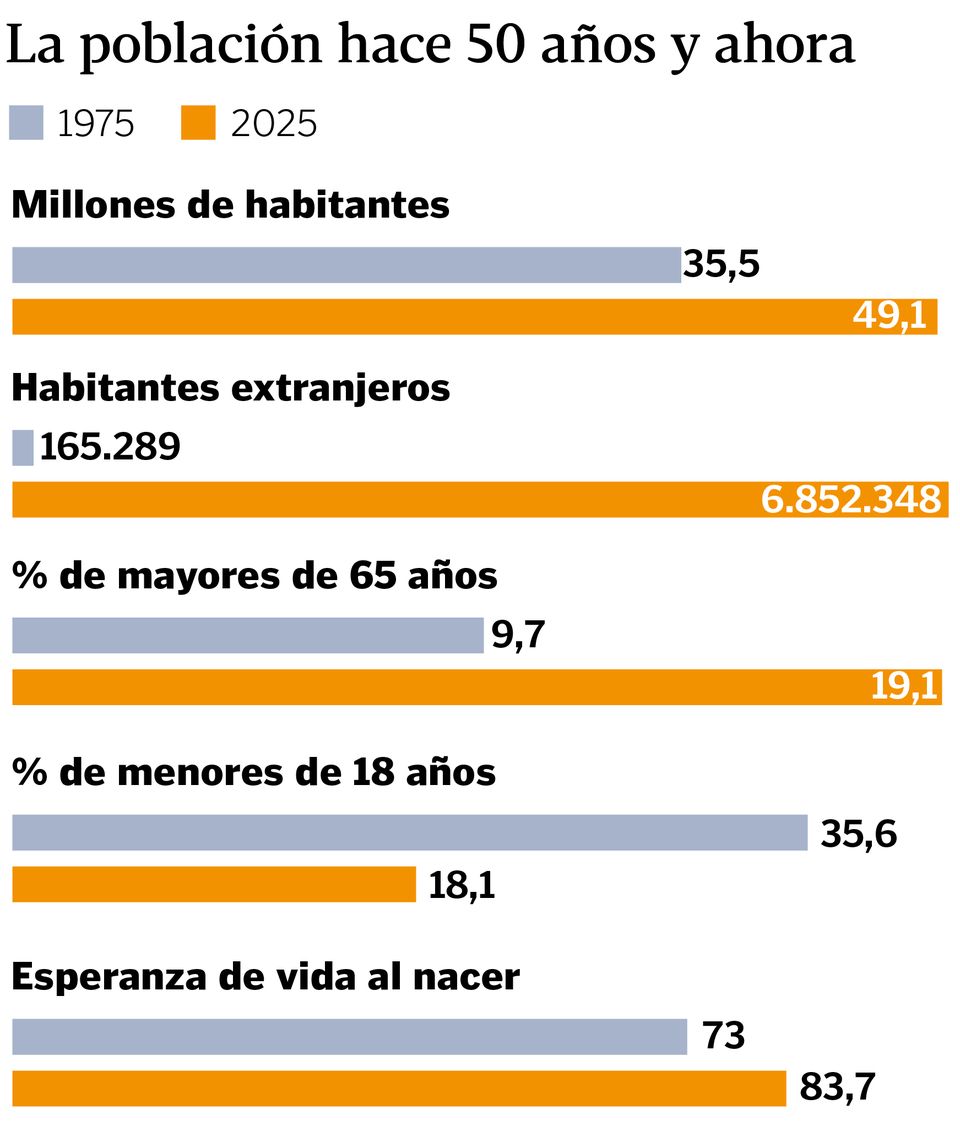 La maternidad se estrenaba, por término medio, a los 25,2 años frente a los 31,5 de esta década. La media de hijos era casi de tres por mujer, y ahora solo la llegada de extranjeros permite que la cuenta se quede en 1,1. Por cierto, sin pasaporte español únicamente había 165.000 personas, una ínfima parte de los cerca de siete millones actuales.