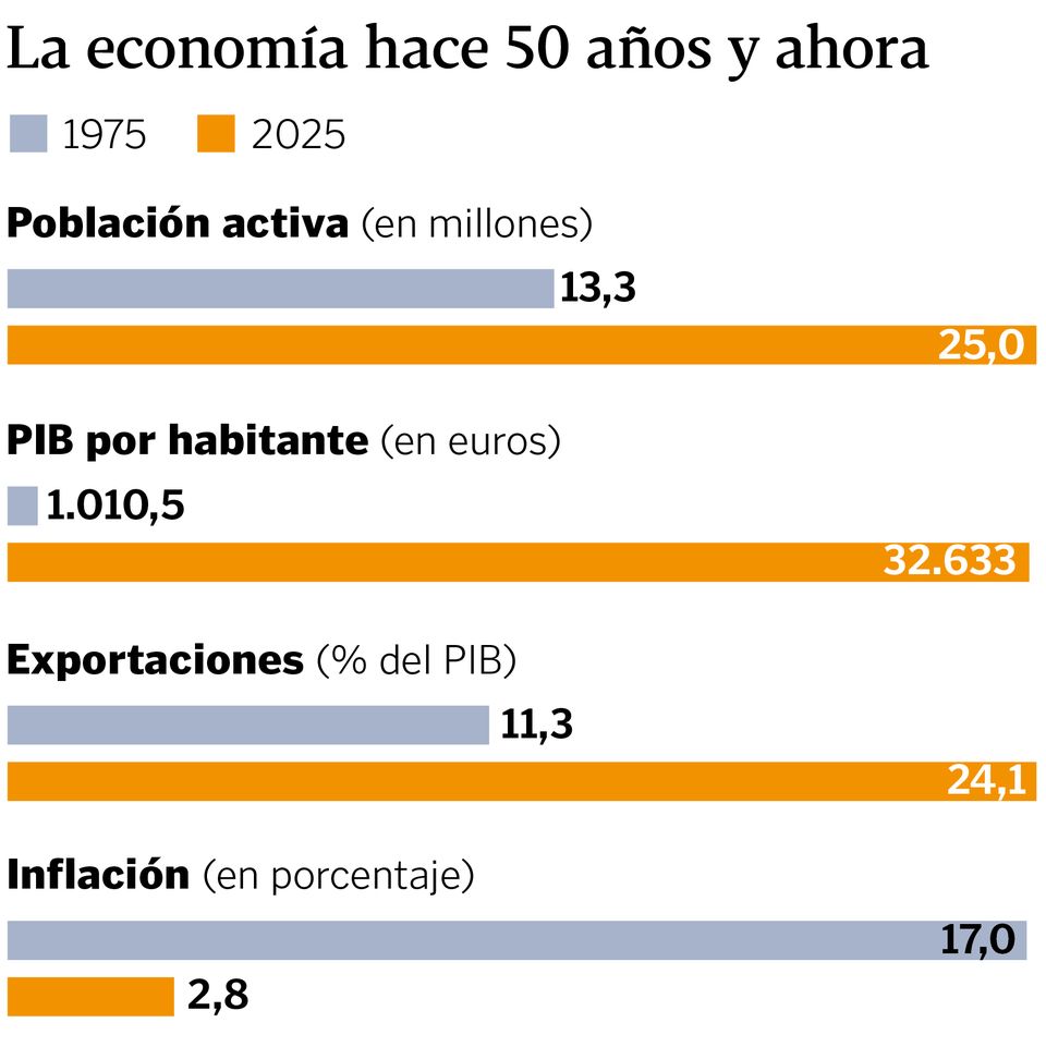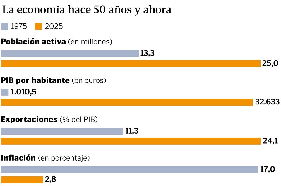 El trasvase del campo a la ciudad dejaba el peso del sector agrícola de 1975 en un 16,9 % del PIB (hoy es del 2,3); la industria crecía hasta un 31 % (quince puntos menos ahora), y el turismo en el que España comenzaba a poner todas sus fichas como prueba del algodón de la modernidad atraía a 27 millones de personas. 76 llegan ahora a la España de 50 años después de Franco.