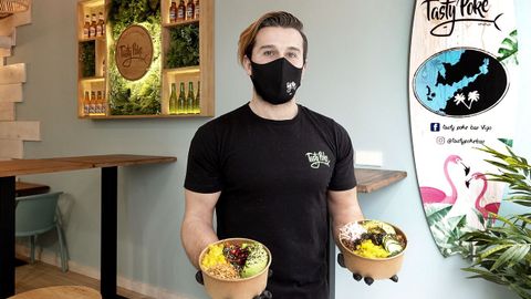 En la lista de ingredientes imprescindibles de Héctor Calvelo, encargado de Tasty Poke Vigo, que abrió hace tan solo unos meses, aparece: el mango, el guacame (alga), el edamame (haba de la soja) y el masago (huevas de pez) sobre una base de arroz. «Los que más salen suelen llevar esos ingredientes, luego claro, siempre hay al que le gusta más la piña que el mango», explica. En este local cuentan con 12 recetas hechas, pero también dan la opción de elaborarlo libremente siguiendo los pasos. «Una base, una proteína, cuatro toppings (frutas y vegetales), dos crunchis (sésamo, cebolla crujiente...) y una salsa», señala.