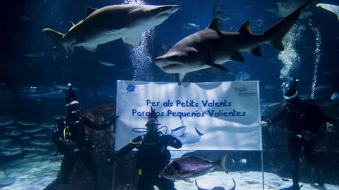 La terapia asistida con perros, los payasos de hospital, la musicoterapia, los talleres de canto, la arteterapia o los grafitis son algunas de las actividades que el centro les ofrece para conseguir que su paso por el hospital sea más llevadero. Orozco, acompañado de tres niños, entre ellos su hijo, se ha sumergido en el Oceanario y, rodeado de tiburones, peces raya y doradas, ha desplegado una pancarta para felicitar la Navidad a «los pequeños valientes», tal como se podía ver en la pancarta.