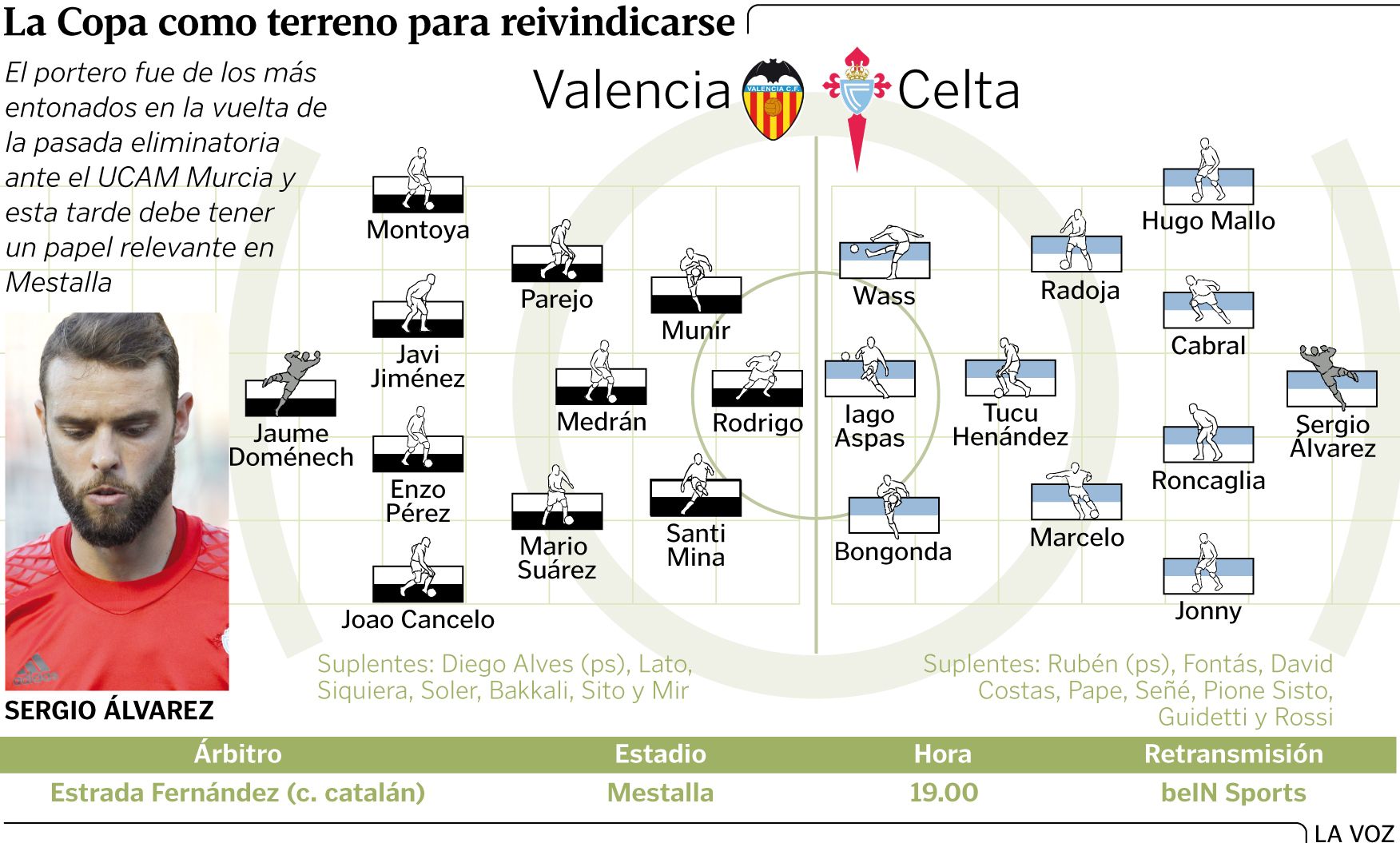 03 ene 2017 . Actualizado a las 17:54 h.La Copa del Rey no es un torneo menor para el Celta. Ni el año de la vuelta a Europa pasa a un segundo plano. Al contrario, Berizzo la coloca a estas alturas de inicio de año por delante incluso de la Liga, aunque reconoce que en el torneo de la regularidad necesitan sumar para acabar la primera vuelta más cerca de la zona noble. Por eso el cuadro vigués saldrá con todo lo disponible esta noche en Mestalla, sin guardarse nada para la visita dominical del Málaga en la apertura de Balaídos en el 2017.