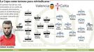 En el Valencia, con Voro ya con plenos galones, el drama aparece para el centro de la defensa, sin un solo central del primer equipo disponible: Mangala, Ezequiel Garay y Santos están descartados y Abdennour convocado con la selección de Túnez, lo que abre las puertas a que Javi Jiménez, del Mestalla, pueda debutar haciendo tándem con Enzo Pérez, el centrocampista argentino que tendrá que reconvertir su posición. Del medio campo para arriba, los valencianistas contarán con casi todo su arsenal, con jugadores de nivel que pueden despertar en cualquier momento. Con el peligro añadido de ser un grande herido.