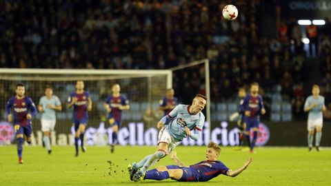 Los goles marcaron el desarrollo del partido y el estado de ánimo de un Celta que salió mejor. El control del encuentro de inicio fue para un equipo vigués al que los visitantes dejaron hacer, ganándoles la batalla de la posesión y llegando con facilidad, aunque sin peligro. Presionaba muy bien el Celta, que solo en un despiste en el repliegue se encontró con un disgusto. El gol del Barcelona, en una acción aislada de pérdida en el medio del campo y rechace que los culés supieron aprovechar a la perfección, lo cambió todo. Los celestes se vinieron abajo tras el jarro de agua fría y les costó volver por sus fueros. De nuevo un gol, esta vez a favor y anotado por un Pione Sisto que no estaba teniendo su noche, volvió a cambiar la cara al Celta. Se equilibró el partido y con empate se llegó al intermedio.