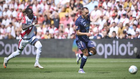El Celta firmó un buen primer tiempo en Vallecas. Serio en defensa, con apenas un par de concesiones, y con llegada en ataque, con una ocasión muy clara de Borja Iglesias (uno de los siete cambios en el once de Claudio Giráldez), que fue un incordio para Lejeune. Los vigueses en ningún momento renunciaron a jugar el balón, buscando la mayoría de las veces la salida por la banda, pero en esta ocasión, tampoco tuvieron remilgos para recurrir a lanzamientos en largo en busca de los centímetros y la corpulencia del delantero compostelano. Todo, con el fin de saltarse la presión de un Rayo Vallecano que no estaba cómodo en el partido, porque tenía problemas para defender y no encontraba espacios para atacar.