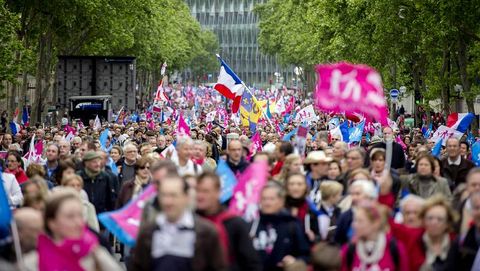 26 may 2013 . Actualizado a las 21:33 h.Decenas de miles de opositores a la ley de matrimonio homosexual, recién promulgada en Francia, salieron a las calles de nuevo el domingo en París, en una manifestación rodeada de fuertes medidas de seguridad, dado que las autoridades temían acciones violentas de grupos de ultraderecha.