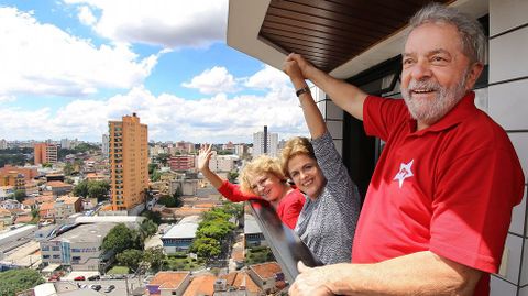 En segundo plano, Dilma Rousseff viajó ayer a São Paulo y se reunió con Lula en su casa de São Bernardo do Campo para diseñar una estrategia. En el entorno de Rousseff temen que el arresto del expresidente contribuya a acelerar el proceso de destitución en contra de la jefa de Gobierno. Entretanto, cientos de simpatizantes del PT se agolparon frente a la casa del exmandatario para vitorearlo. Lula salió a saludarlos junto a Dilma, que, aquejada por una crisis política y económica que apenas le ha dado tregua durante este segundo mandato, había manifestado el viernes su disconformidad con el operativo de Moro y ayer viajó para expresar apoyo a su padrino político.